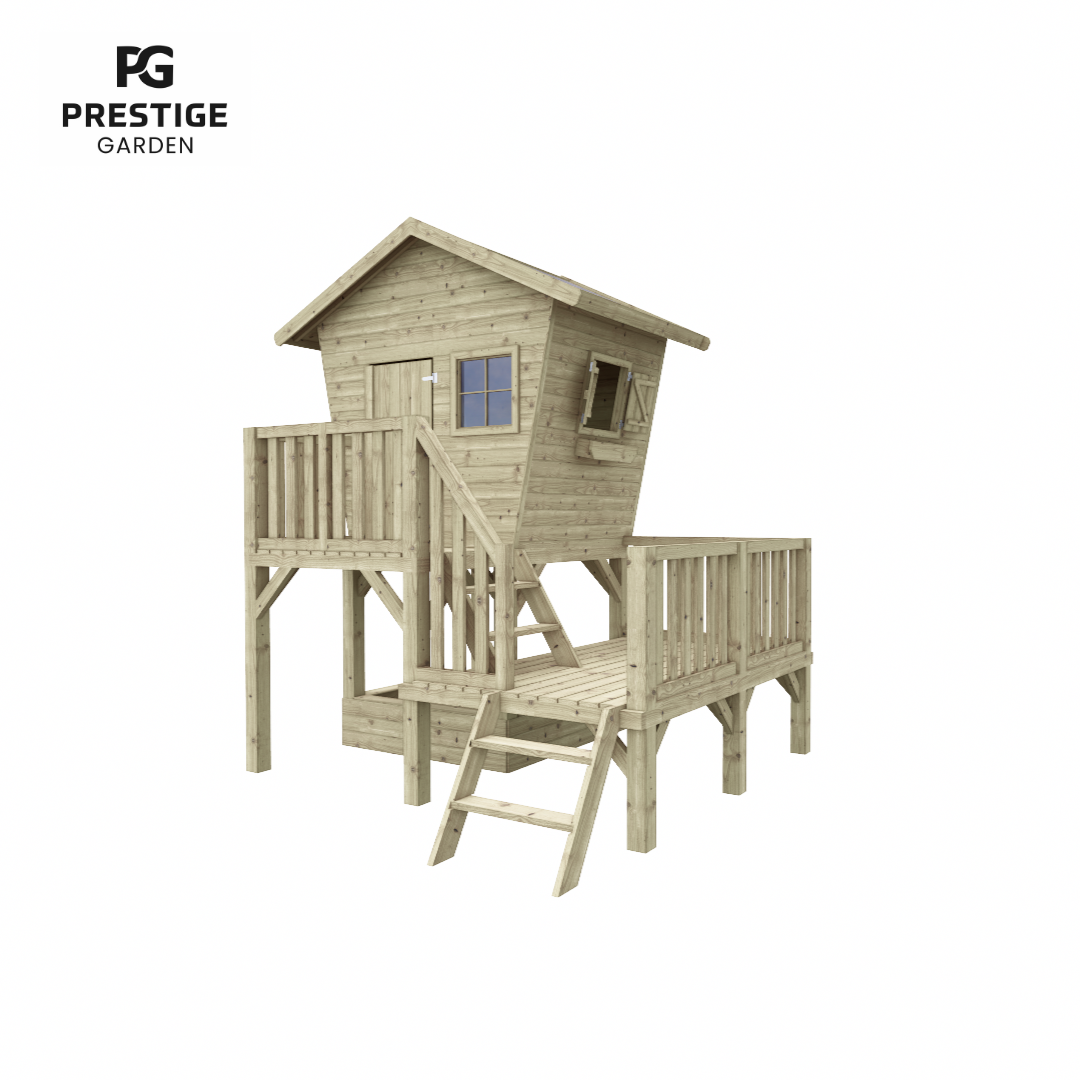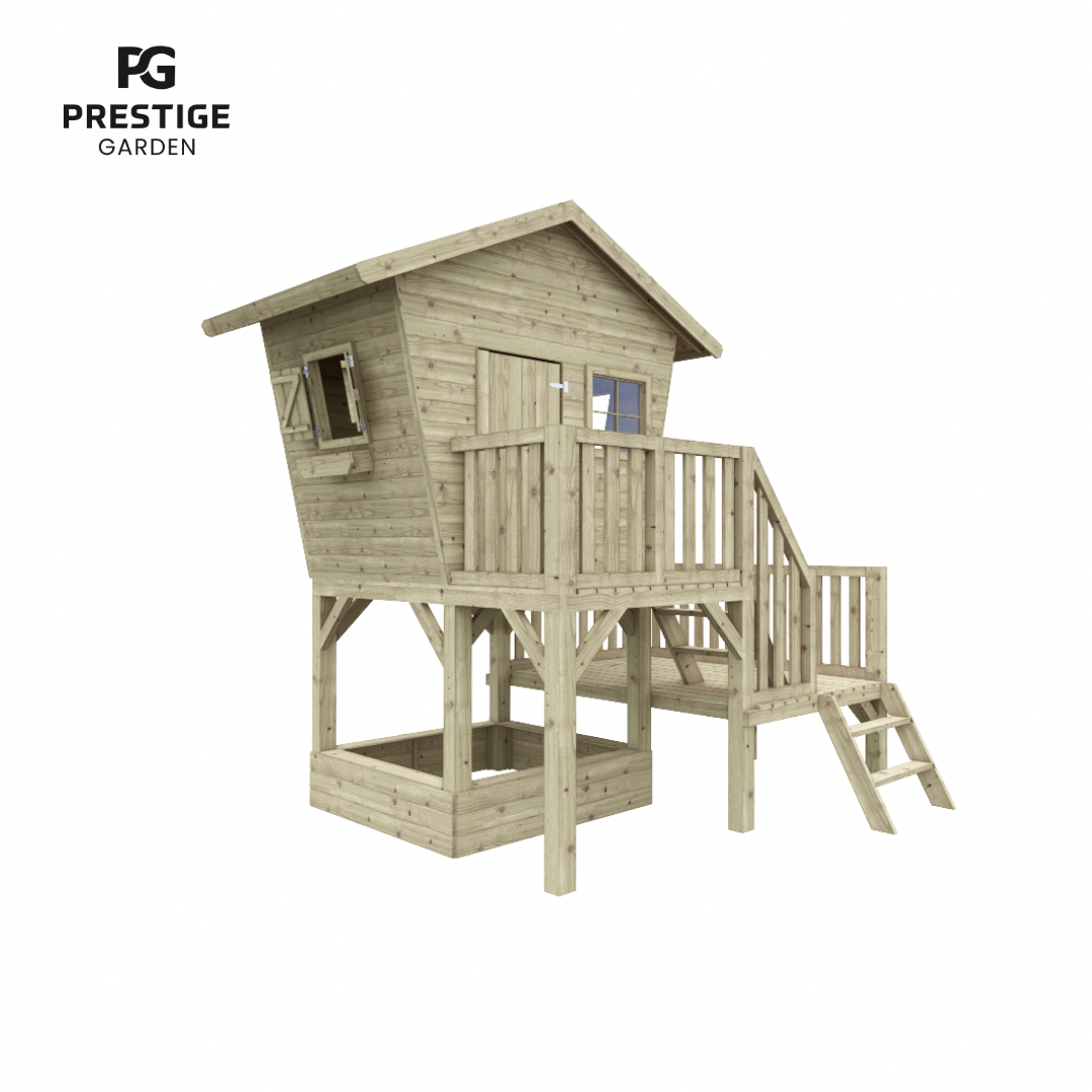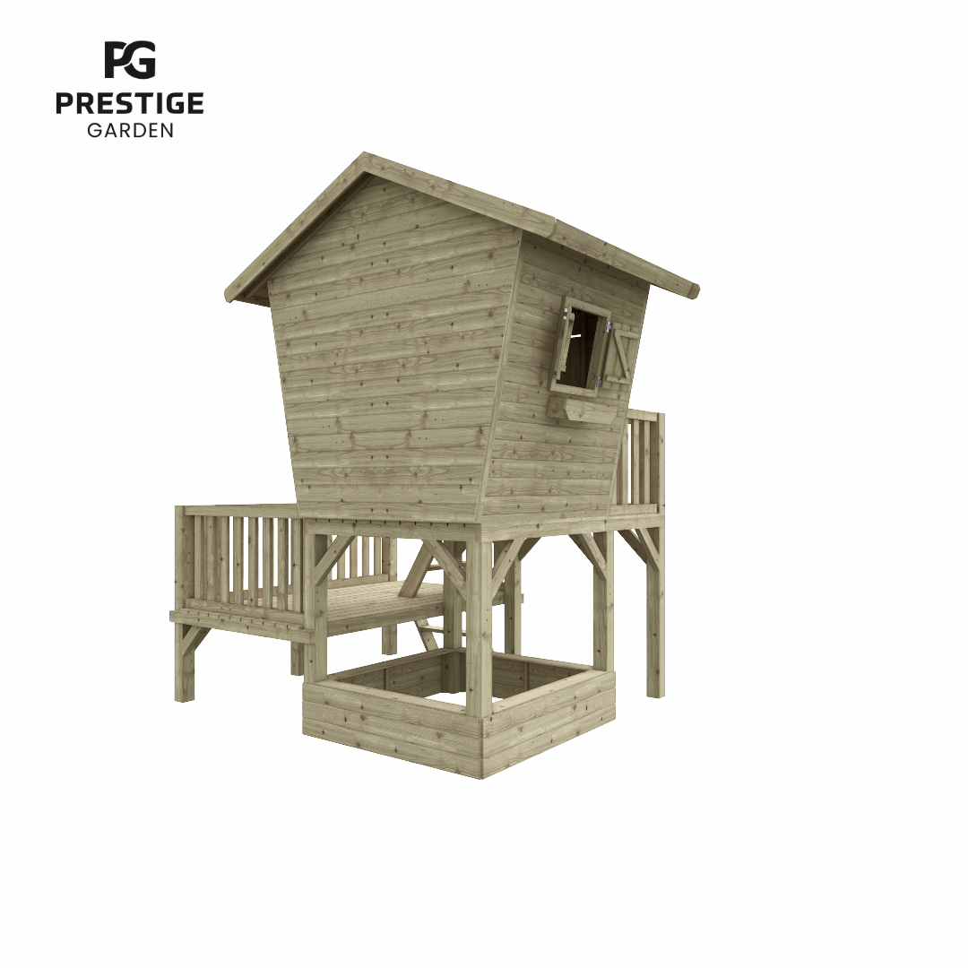 Dit duurzame en stevige speelhuis biedt kinderen eindeloze mogelijkheden om te spelen en hun verbeelding te laten spreken. Het speelhuis wordt geleverd met een zandbak en een glijbaan, en kan verder worden uitgebreid met leuke accessoires zoals een klimwand of een brievenbus. Het is mogelijk om aan de achterkant van dit speelhuis een aanbouwschommel van Prestige Garden te plaatsen. Deze kunt u vinden via deze link: Aanbouwschommel dubbel Prestige Garden | Houten Speelhuizen