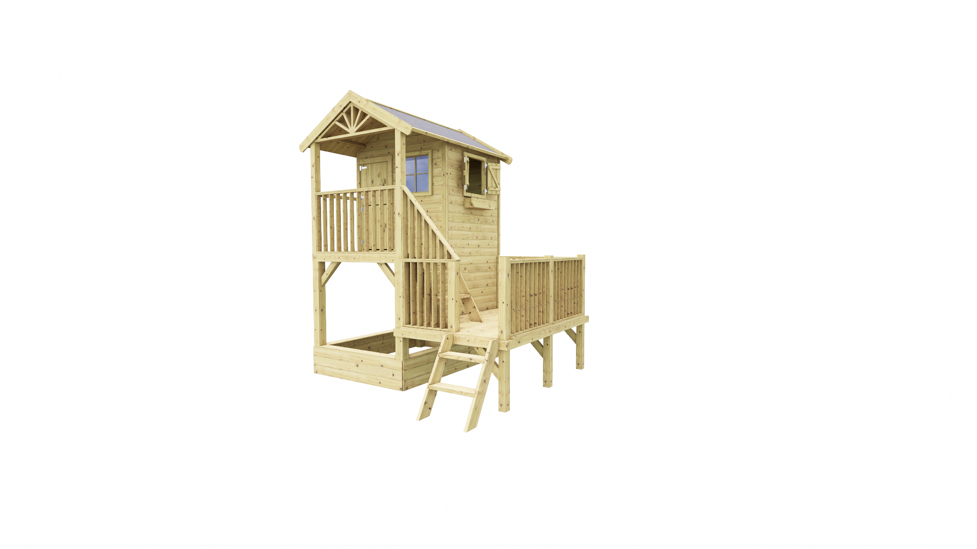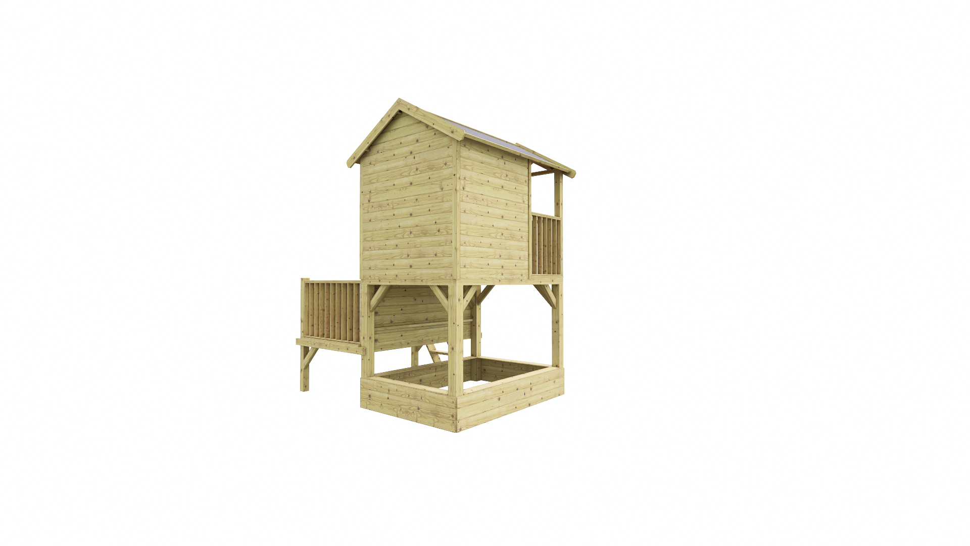 Let op: het speelhuisje wordt geleverd zonder dakbedekking. Deze is eenvoudig bij te bestellen. Wij adviseren daarnaast om paalpunten mee te bestellen, zodat de poten beter beschermd zijn tegen optrekkend vocht en de levensduur wordt verlengd.