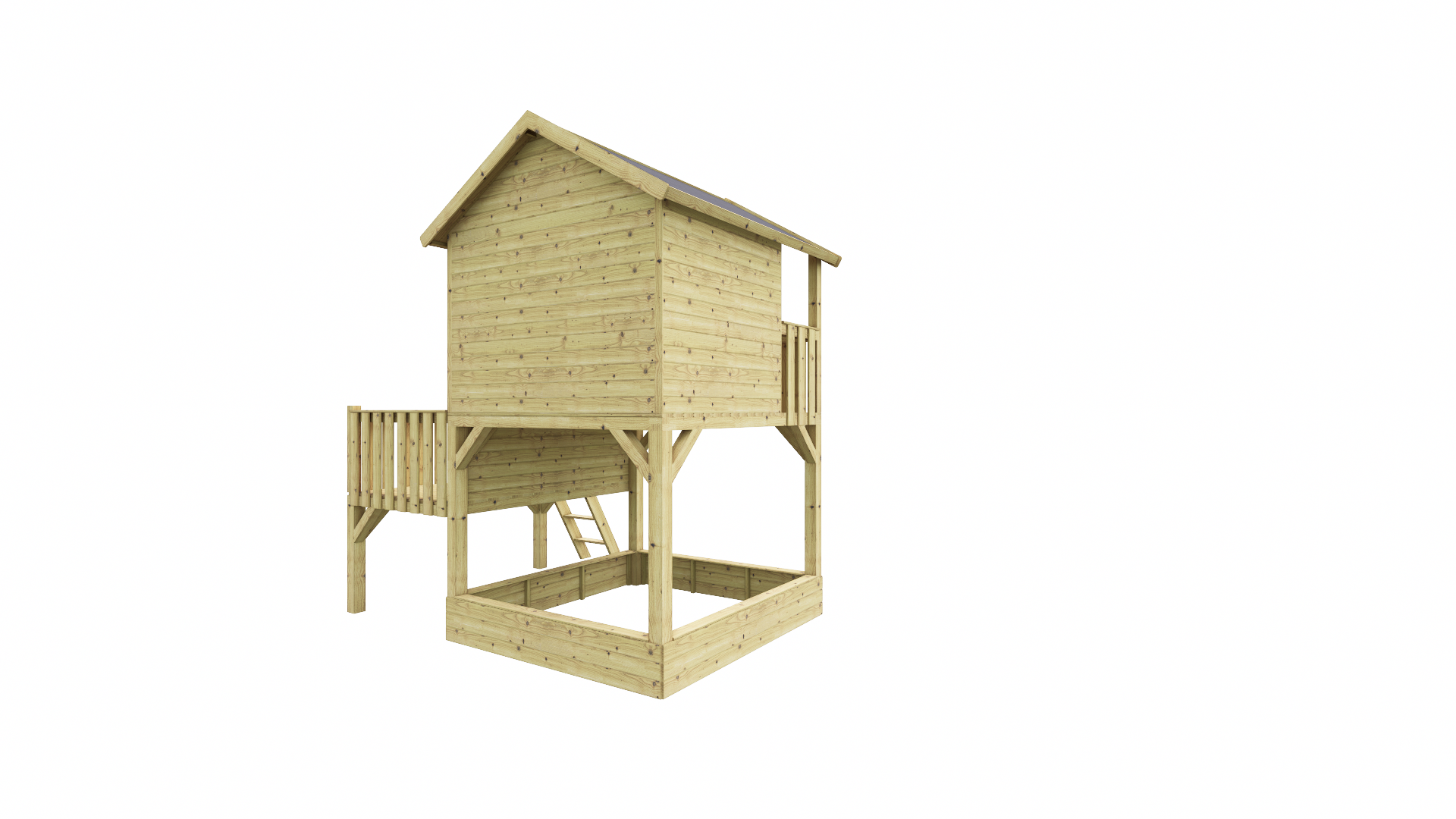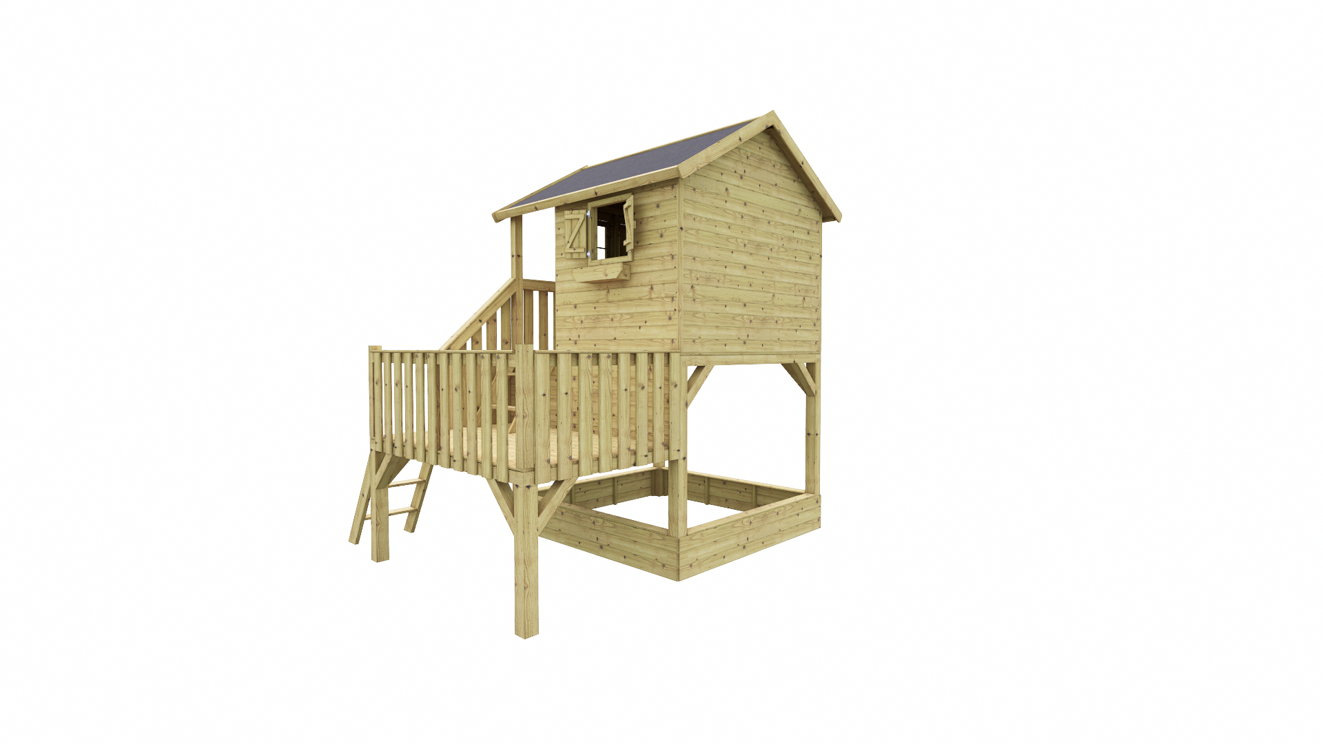 Via het stevige trapje klimmen kinderen veilig naar boven, waar ze hun eigen uitkijkpost en speelplek hebben. Onder het speelhuisje bevindt zich een geïntegreerde zandbak, perfect voor bouwen, graven en eindeloos creatief spel.