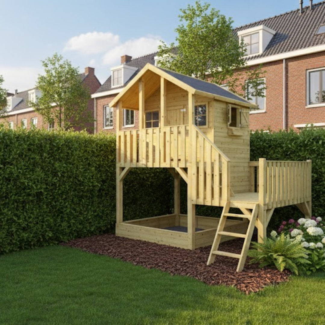 Verhoogd houten speelhuisje met stoere, luxe uitstraling