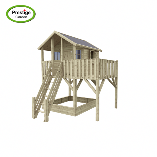 Het speelhuisje wordt geleverd met voorgemonteerde wanden die geïmpregneerd zijn. Het bordes van 150 cm hoog is voorzien van reliëf planken. De traptredes zijn ingekeept voor een stabiele en veilige toegang tot het speelhuisje. Bij de luikjes en deur is extra ruimte zodat de vingers niet bekneld kunnen raken. Het dak is rondom afgewerkt met extra brede boeidelen. De staanders van het huisje zijn 9×9 cm. Ons advies is om deze te verankeren met speciale paalpunten, zodat de levensduur verlengd wordt en de poten beter beschermd worden. Kunnen bijbesteld worden.