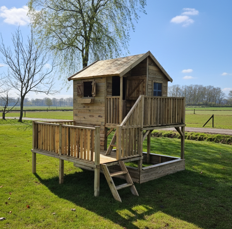 Op zoek naar een veilige, duurzame en gezellige speelplek voor je kinderen? Het Brussel Luxe L is een ruim, verhoogd houten speelhuisje met een balkon, extra zijterras en een zandbak onder het huisje. Hier kunnen kinderen klimmen, spelen en creatief bezig zijn, terwijl jij met een gerust hart toekijkt.