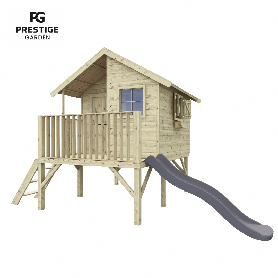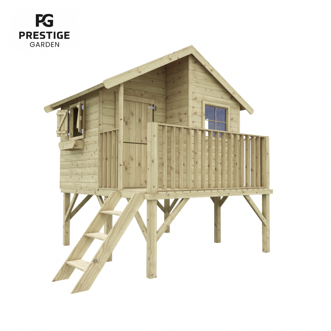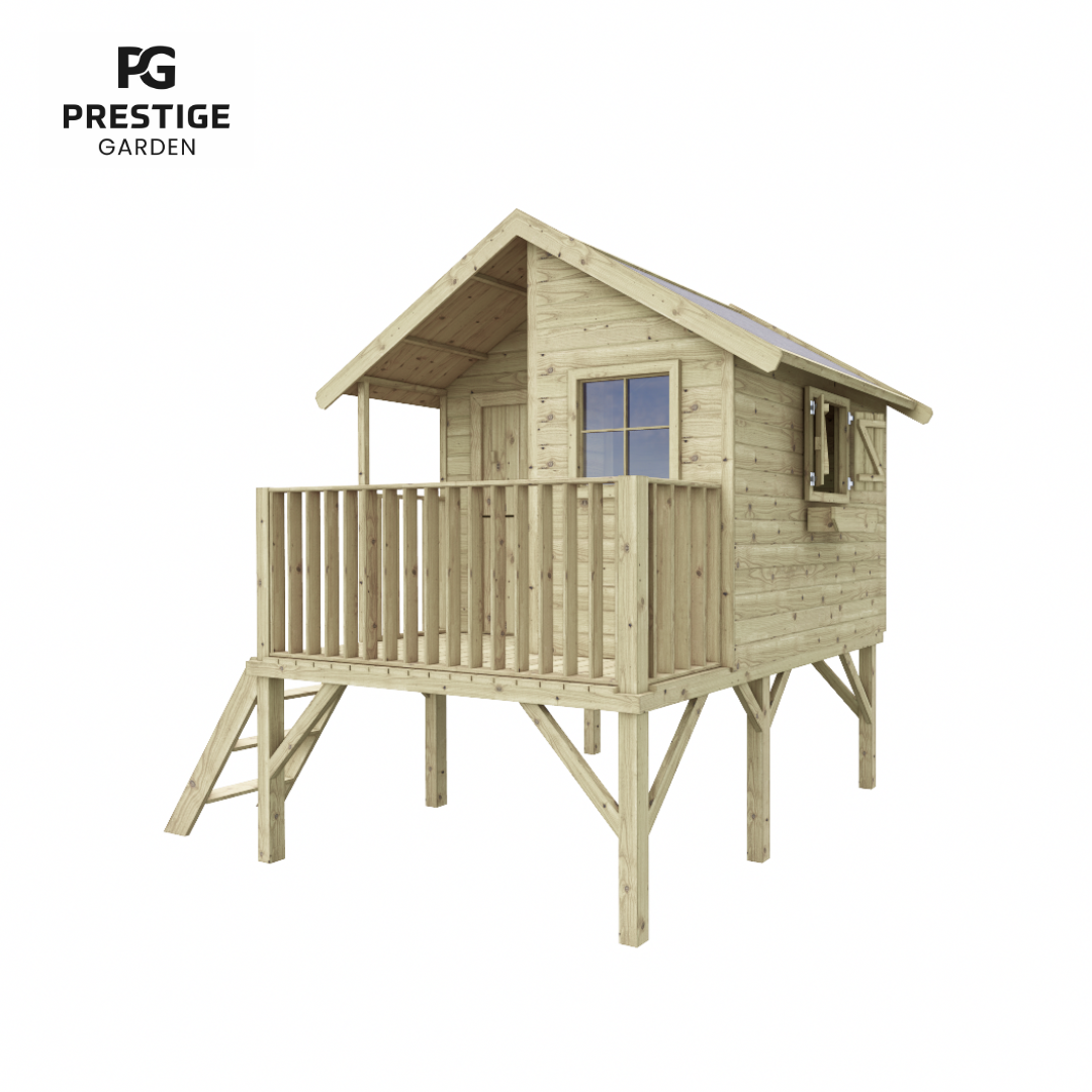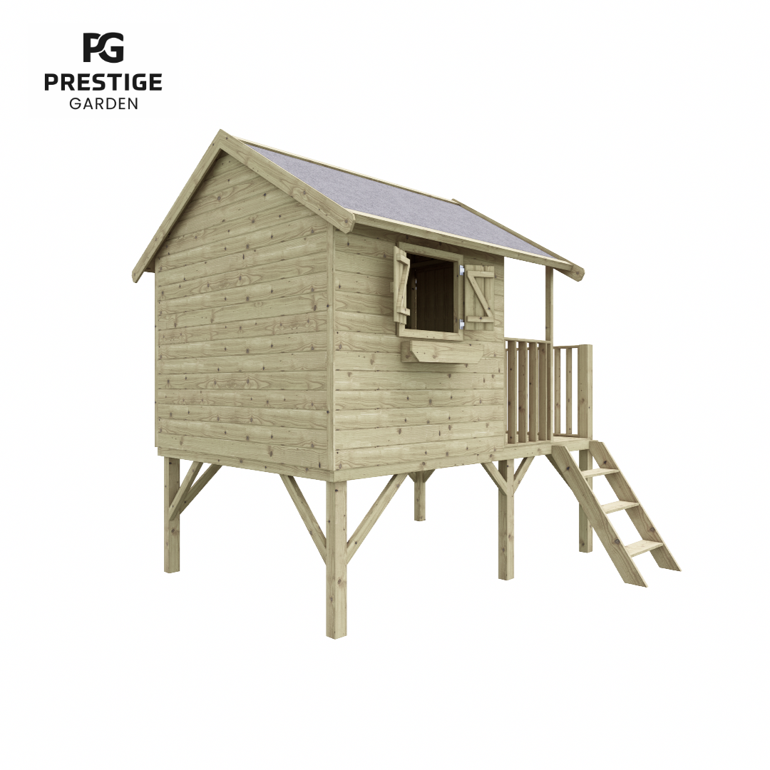 Het speelhuisje wordt geleverd met voorgemonteerde wanden, wat het in elkaar zetten een stuk eenvoudiger maakt. De wanden zijn geïmpregneerd, wat de levensduur verlengt. Natuurlijk zit er bevestigingsmateriaal en een handleiding bij. Om de poten van het speelhuisje te beschermen raden wij aan om ze te verankeren in speciale paalpunten (deze zijn bij te bestellen)
