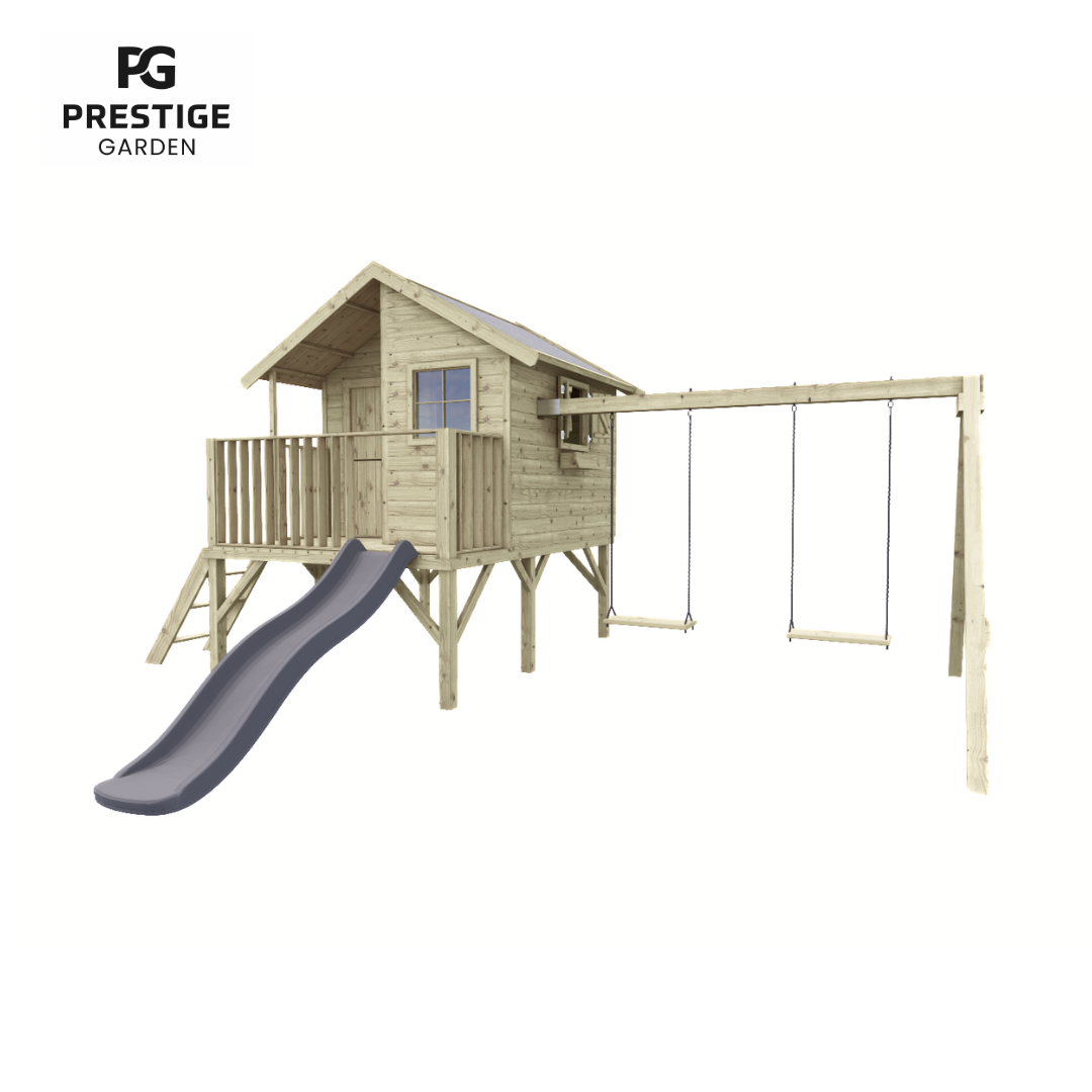 Gegarandeerd uren speelplezier in houten speelhuis Brussel. Het ruimtelijk ontworpen speelhuis heeft een charmant puntdakje met extra brede boeidelen. Dit zorgt voor een natuurlijke uitstraling, zodat het speelhuisje bijna transformeert tot een klein woonhuisje. Bij de ramen en deur is extra ruimte gelaten, zodat de vingers niet bekneld kunnen raken tijdens het spelen. Deze variant is inclusief glijbaan en aanbouwschommel (dubbel).