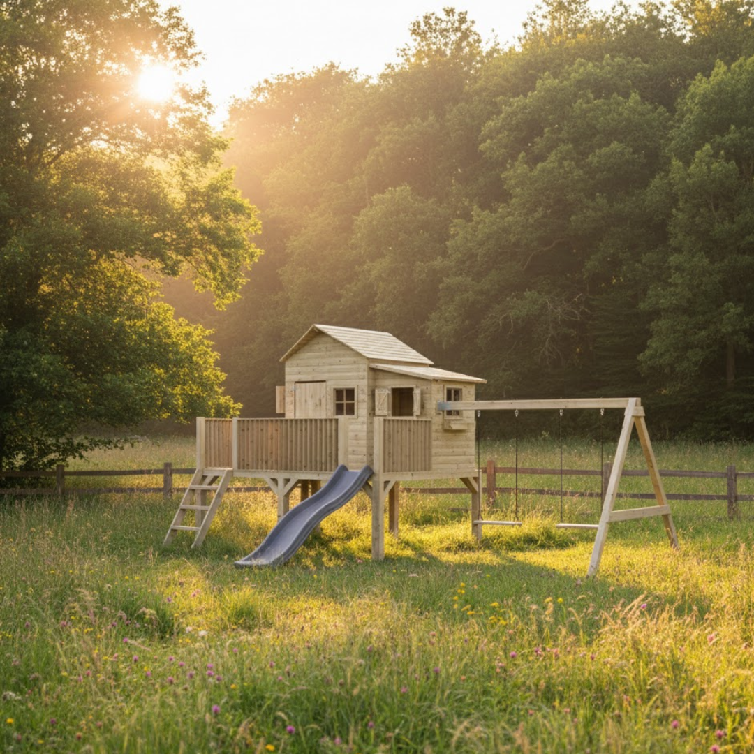 Let op: dakleer, schommelzitjes en andere accessoires niet inbegrepen, wel eenvoudig bij te bestellen.