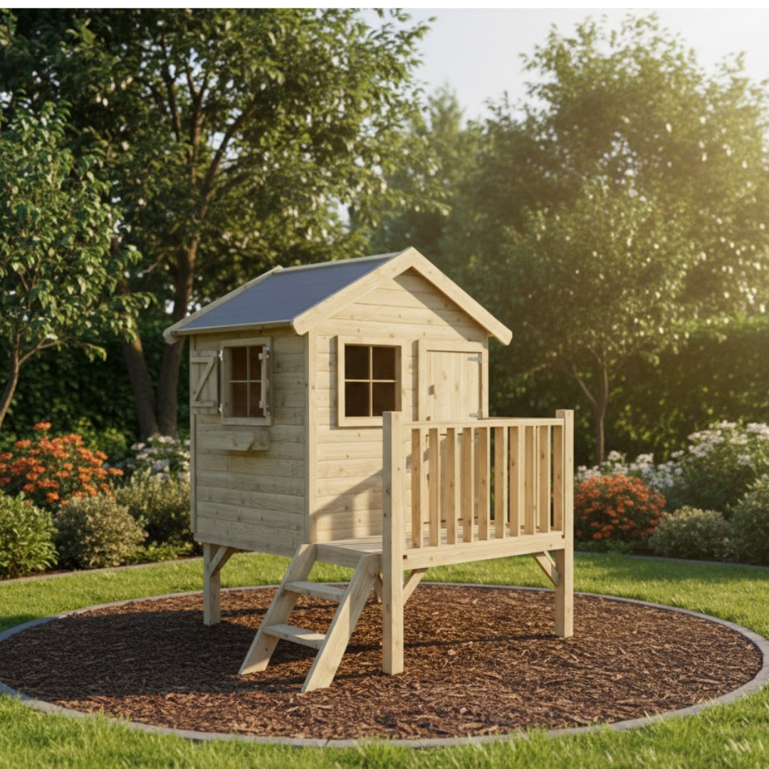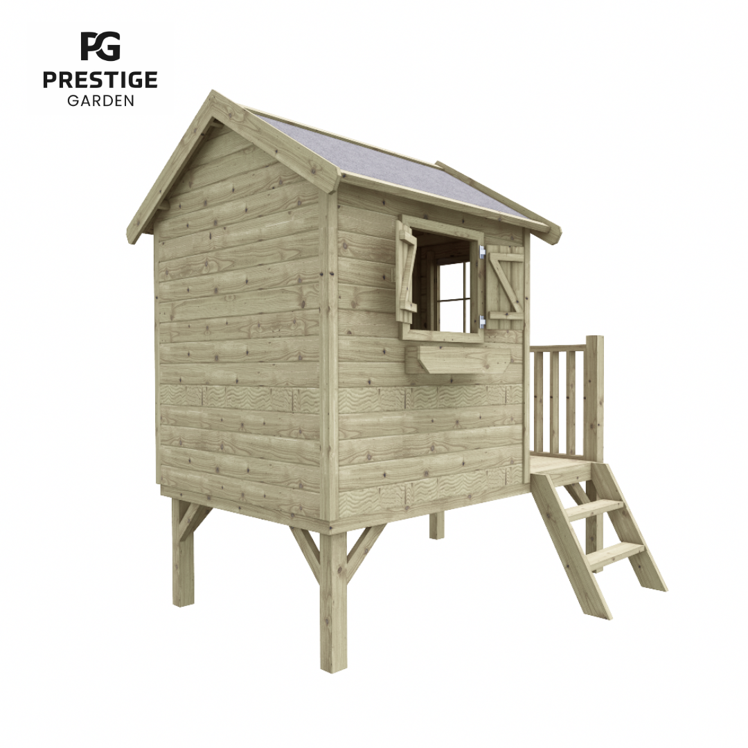 In de Prestige Garden-serie vind je ook model Funny L. Dit houten speelhuis staat op een verhoogd platform, wat zorgt voor een speelse en vrolijke uitstraling. Het huisje is uitgerust met een tweedelige deur, een veranda met balustrade, luikjes, een bloembak en een trapje. Alles wat kinderen nodig hebben om hun eigen fantasiewereld te creëren. Er is bewust extra ruimte gelaten tussen de deuren en luiken, zodat kleine vingers niet bekneld kunnen raken tijdens het spelen.