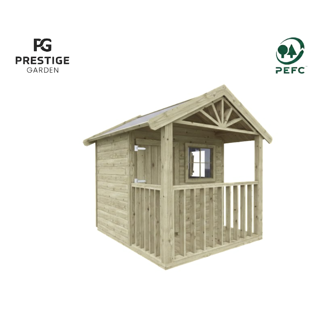 Funny M is een huisje wat in veel tuinen past en voor vele uren speelplezier zorgt. Uitgevoerd met extra brede boeidelen, stevig hekwerk/ balustrade en een tweedelige deur. De luikjes bij 1 raam met bloembak geven het huis een gezellige uitstraling. De overdekte veranda zorgt voor extra speelruimte. De ruimte tussen de zijkanten van de deur en de luikjes is een extra beveiliging zodat de vingers niet bekneld kunnen raken. Ook is speelhuis funny m uit te breiden met leuke accessoires, zoals bijvoorbeeld een brievenbus of een telefoon.