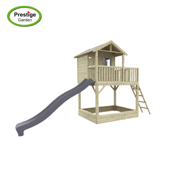 Het 150 cm hoge overdekte platform is inclusief een 300 cm glijbaan. Optioneel kan het platform worden ingekort tot 120 cm door het inkorten van de palen en ladder. (De instructies hiervoor zijn opgenomen in de montagehandleiding.) Houd hier wel rekening mee bij het evt. bestellen van de glijbaan. Indien u de hoogte wilt verkleinen naar 120 cm, dan is een 240 cm lange glijbaan nodig. De glijbaan kan ook op een andere kant gemonteerd worden.