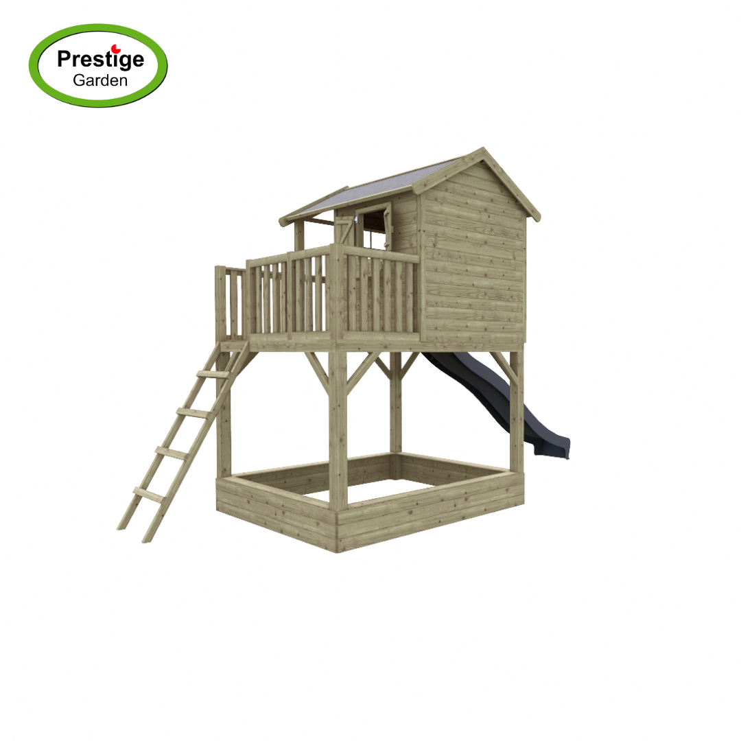 Deze houten paalwoning met extra brede boeidelen is een echte blikvanger in je tuin en zorgt voor vele uren speelplezier van de kinderen. Speelhuis Funny XXl is voorzien van een overdekte veranda en een groot balkon welke te bereiken is via de houten ladder. Aan de voorzijde van de paalwoning is een raam van plexiglas en in de zijgevel een raamuitsparing met leuke luiken en een huiselijke bloembak. De tweedelige deur en de luiken zijn voorzien van extra ruimte waardoor de vingers niet bekneld raken tijdens het spelen. Â Extra leuk aan dit huisje is de zandbak die eronder zit, ook hier kunnen de kinderen zich naar hartenlust vermaken.