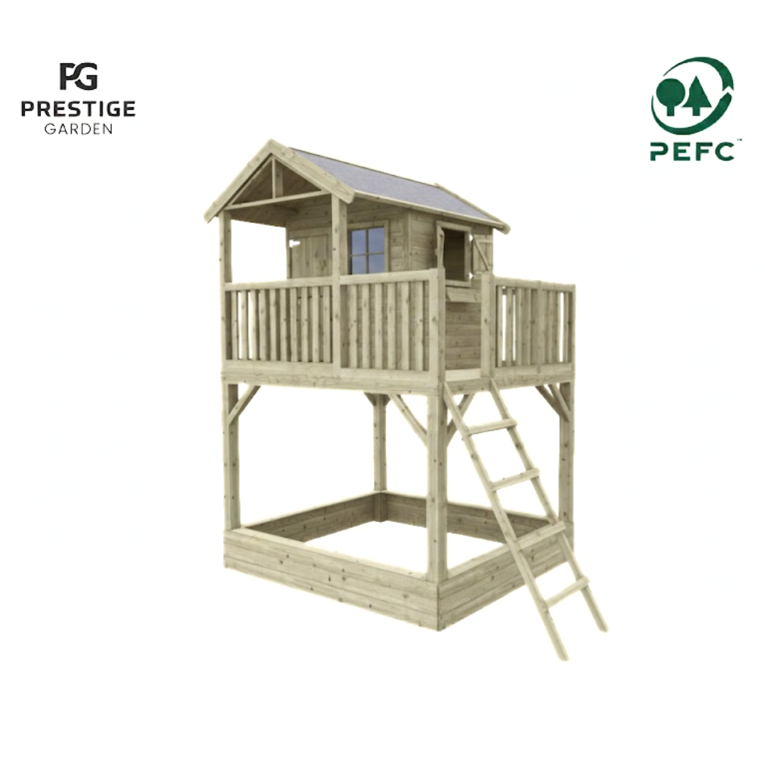 Deze houten paalwoning met extra brede boeidelen is een echte blikvanger in je tuin en zorgt voor vele uren speelplezier van de kinderen. Speelhuis Funny XXl is voorzien van een overdekte veranda en een groot balkon welke te bereiken is via de houten ladder. Aan de voorzijde van de paalwoning is een raam van plexiglas en in de zijgevel een raamuitsparing met leuke luiken en een huiselijke bloembak. De tweedelige deur en de luiken zijn voorzien van extra ruimte waardoor de vingers niet bekneld raken tijdens het spelen. Â Extra leuk aan dit huisje is de zandbak die eronder zit, ook hier kunnen de kinderen zich naar hartenlust vermaken.