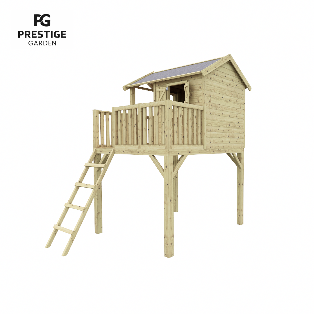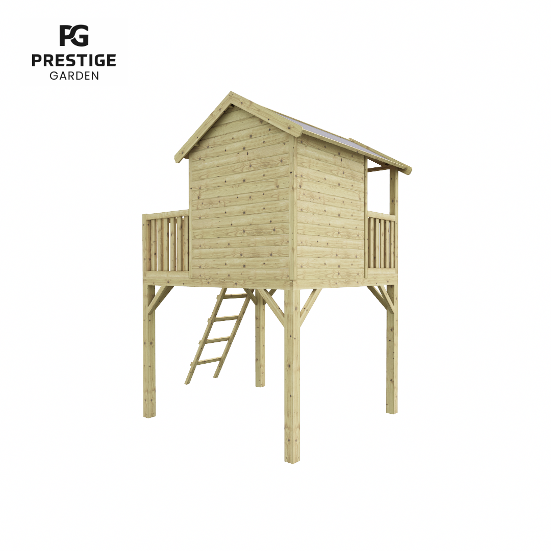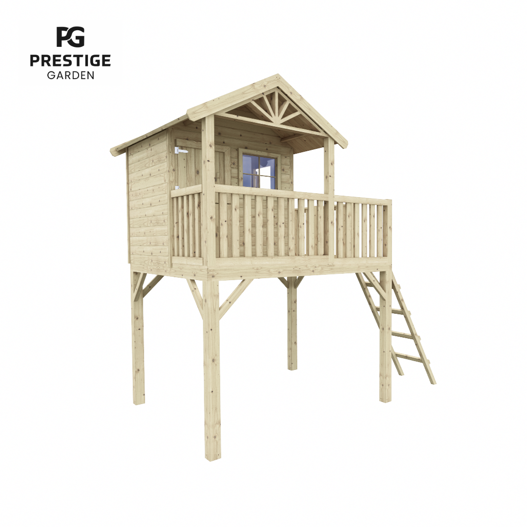 Deze houten paalwoning met extra brede boeidelen is een echte blikvanger in je tuin en zorgt voor vele uren speelplezier van de kinderen. Speelhuis Funny XXl is voorzien van een overdekte veranda en een groot balkon welke te bereiken is via de houten ladder. Aan de voorzijde van de paalwoning is een raam van plexiglas en in de zijgevel een raamuitsparing met leuke luiken en een huiselijke bloembak. De tweedelige deur en de luiken zijn voorzien van extra ruimte waardoor de vingers niet bekneld raken tijdens het spelen. Â De ruimte van dit huisje wordt aan alle kante benut, omdat er onder het huisje ook nog voldoende ruimte is om te spelen.
