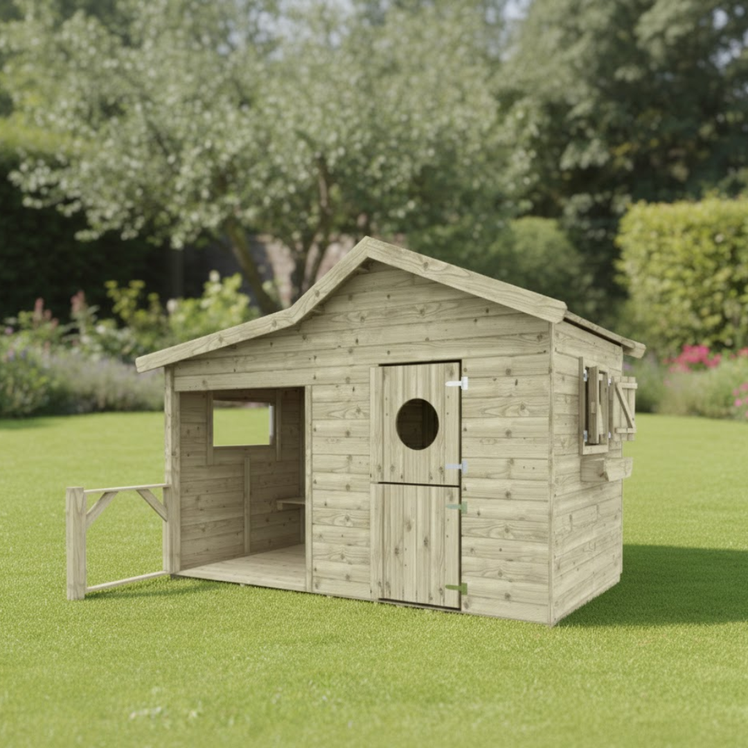 Uniek houten speelhuisje met extra brede boeidelen en een overkapping. De ronde opening in de tweedelige deur zorgt voor een unieke uitstraling. Het puntdak, de luikjes en de bloembak geven het geheel een echt huiselijke sfeer. Dit speelhuisje biedt vele mogelijkheden: de overkapping kan je gebruiken als handige garage voor bijv. fietsjes of er kan een extra speelplek/ zitgedeelte gecreëerd worden. De extra ruimte bij de luikjes en deur zijn een extra beveiliging zodat de vingers niet bekneld kunnen komen.