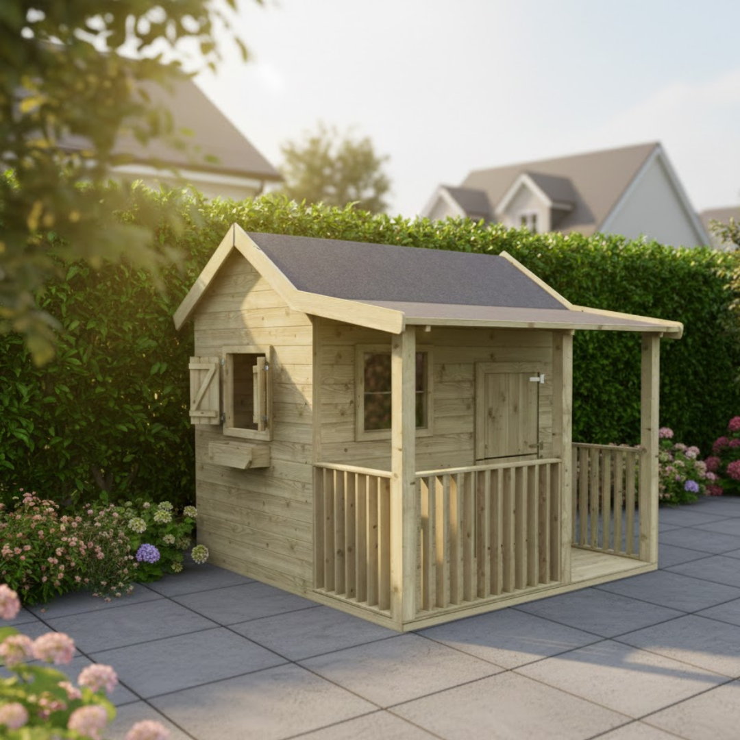 Een weerbestendig houten buitenspeelhuis inclusief leuke veranda met overkapping.