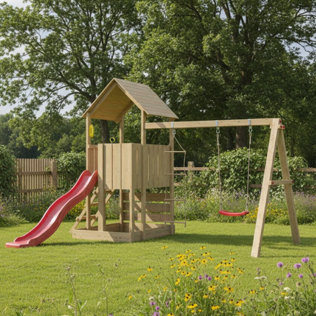 Let op: om de veiligheid van de kinderen te garanderen, moet de speeltoren met grondankers in de grond worden verankerd! Deze kunnen eenvoudig worden meebesteld. Het bijgeleverde schommelzitje is standaard rood. Dit is niet inwisselbaar.